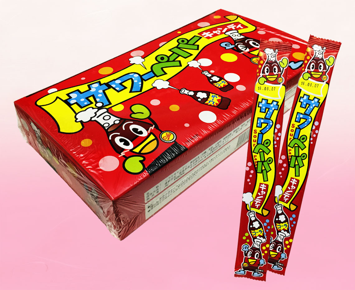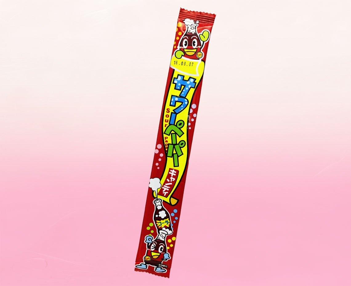 這是一種將酸味糖果拉得很薄而製成的零食, 但它的口感像橡皮糖一樣,很受孩子們的歡迎 ,這是一種長條型的可樂口味零食