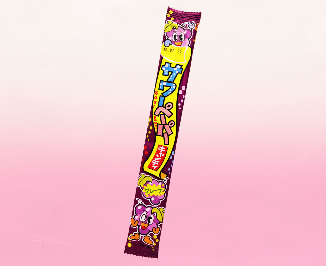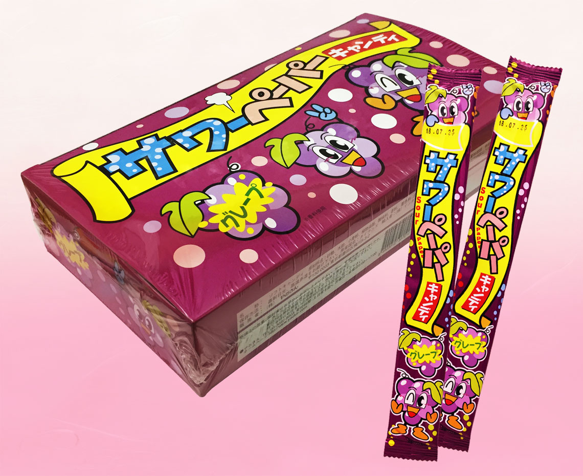 這是一種將酸味糖果拉得很薄而製成的零食, 但它的口感像橡皮糖一樣,很受孩子們的歡迎 ,這是一種長條型的葡萄口味零食